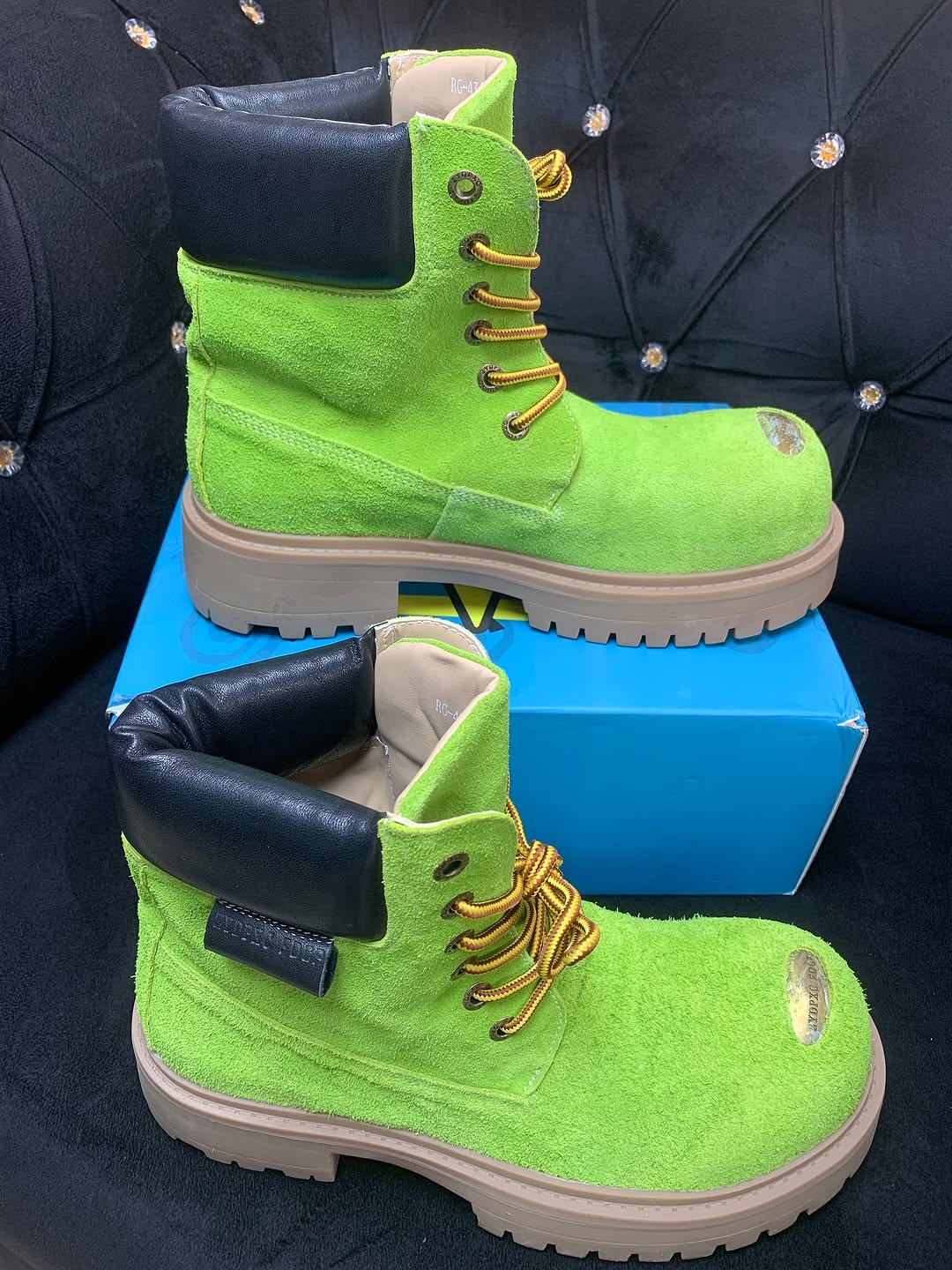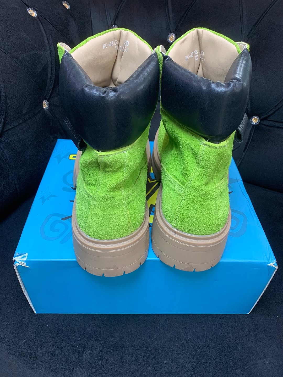 These mossy green suede combat boots feature a vibrant lime green color, contrast lace-up detailing, and heavy-duty, anti-slip soles.ย