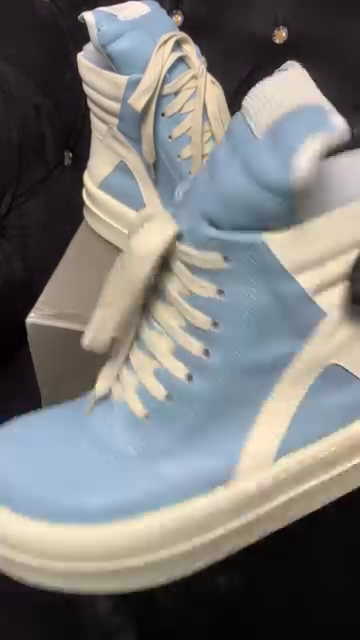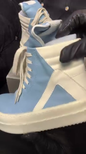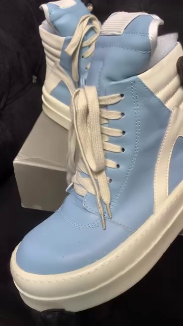 These Rick Owens Geobasket sneakers are high-top designer shoes featuring a distinctive blue and milk-white colorway.ย