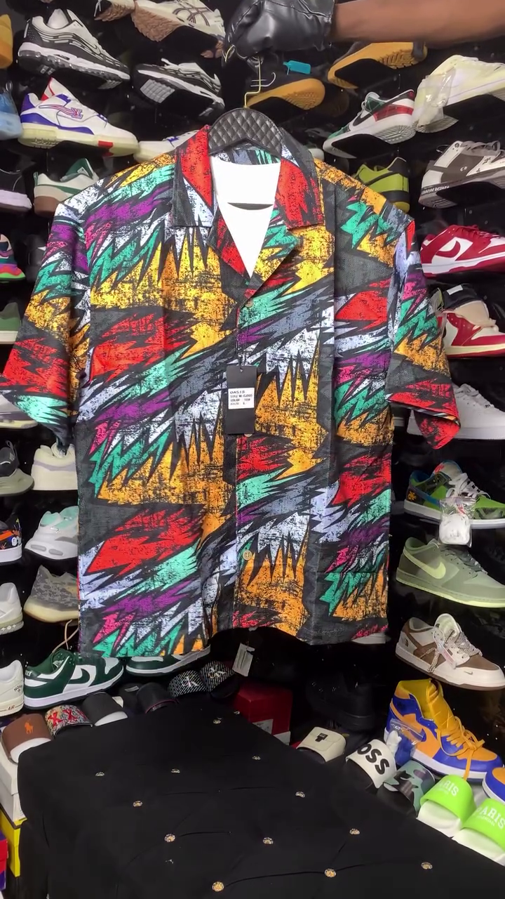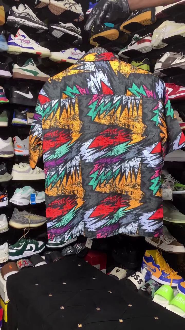 This product is a short-sleeved button-down shirt featuring a colorful 1980s or 1990s style abstract graffiti or Aztec pattern