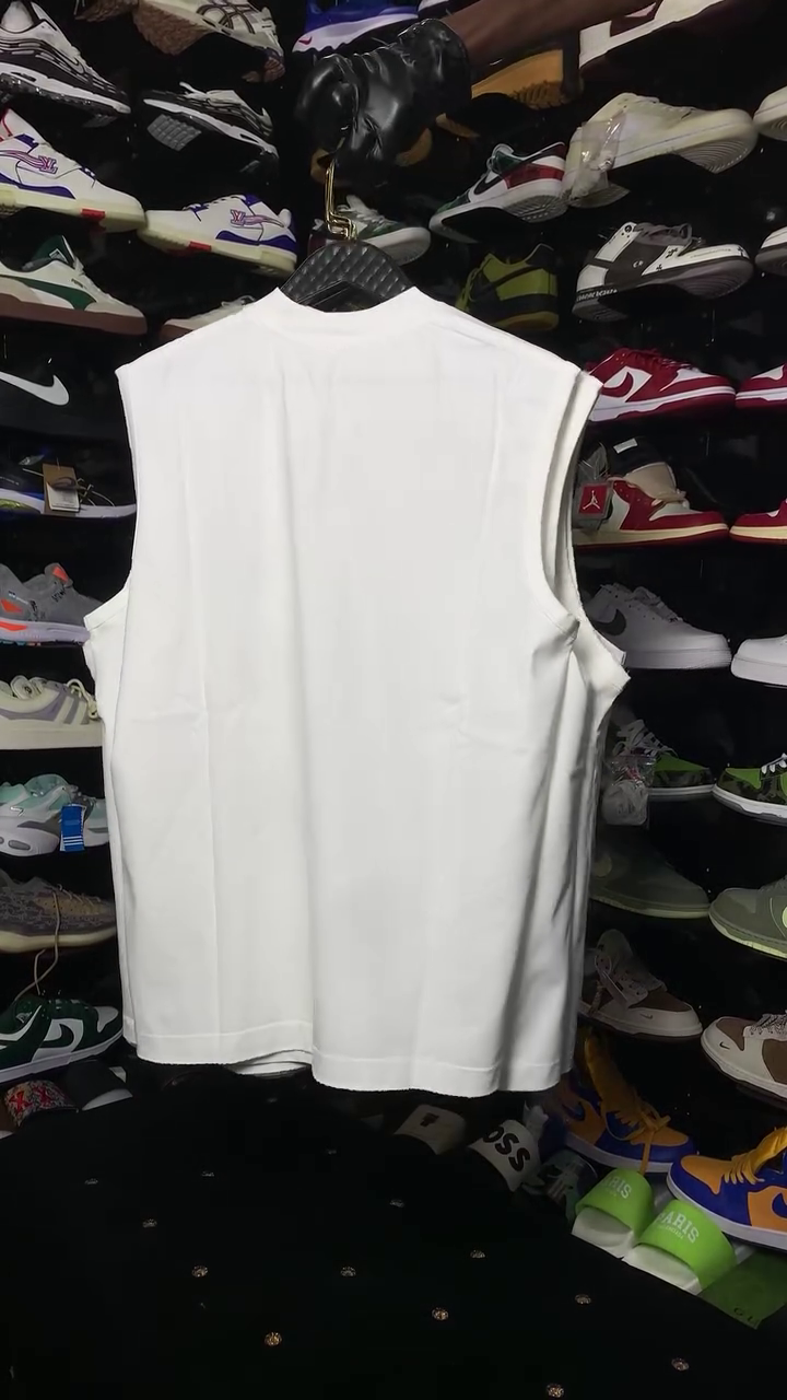 This item is a white sleeveless graphic tank top, a muscle shirt or A-shirt, featuring a black printed design.ย